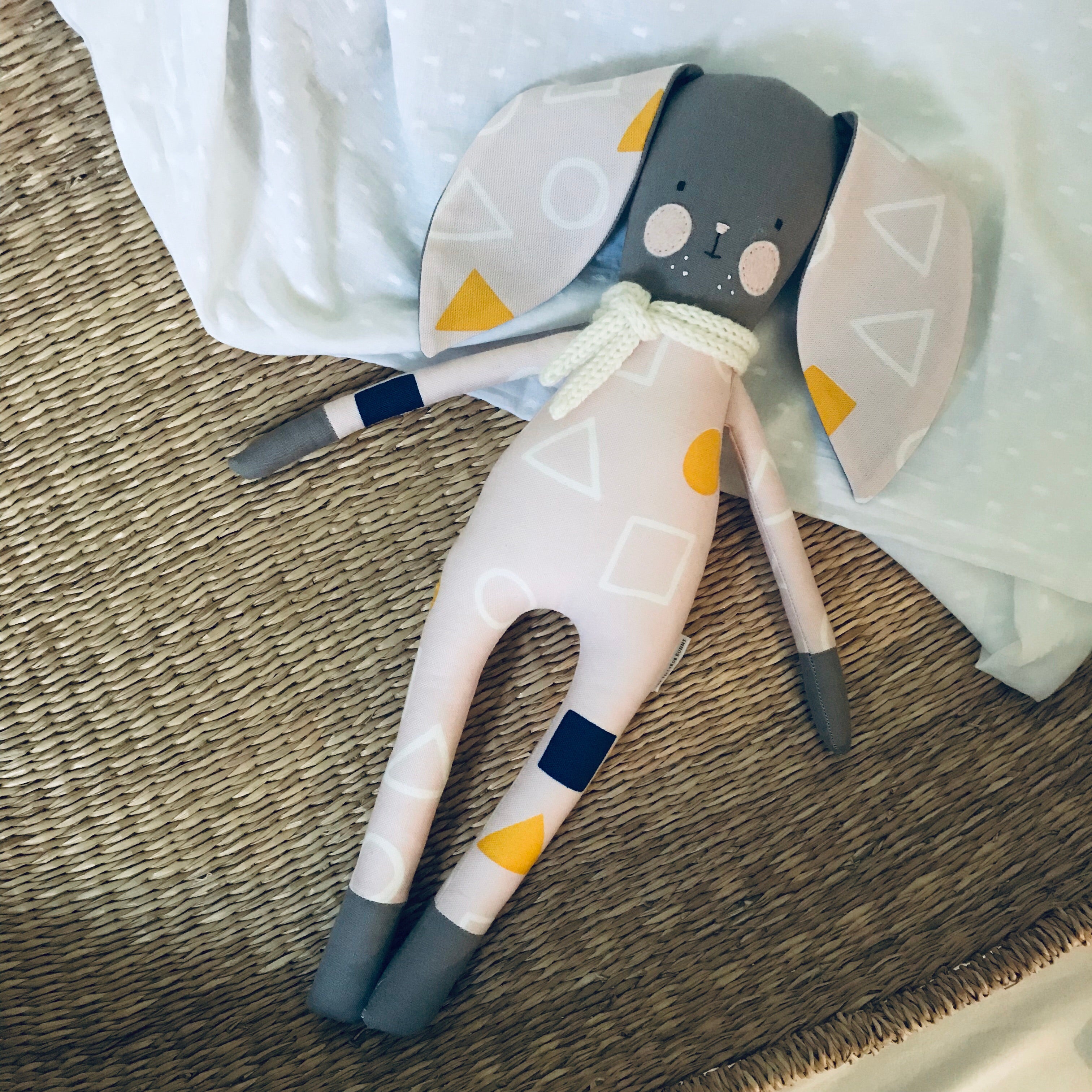 This is the original TillyBob Bunny design. The soft bodied bunny makes a perfect friend for your little one and is easy for small hands to grasp. The bunnies also make a perfect accessory for a new nursery and wonderful keepsake.  Each bunny is completely handmade by Holly and unique. This fun  geometric design has shapes on a lovely pale pink cotton/linen canvas, the bunny also has a cosy wool scarf too! You will be purchasing the TillyBob bunny pictured here. Please note there may be slight colour differences due to lighting and screen resolution.