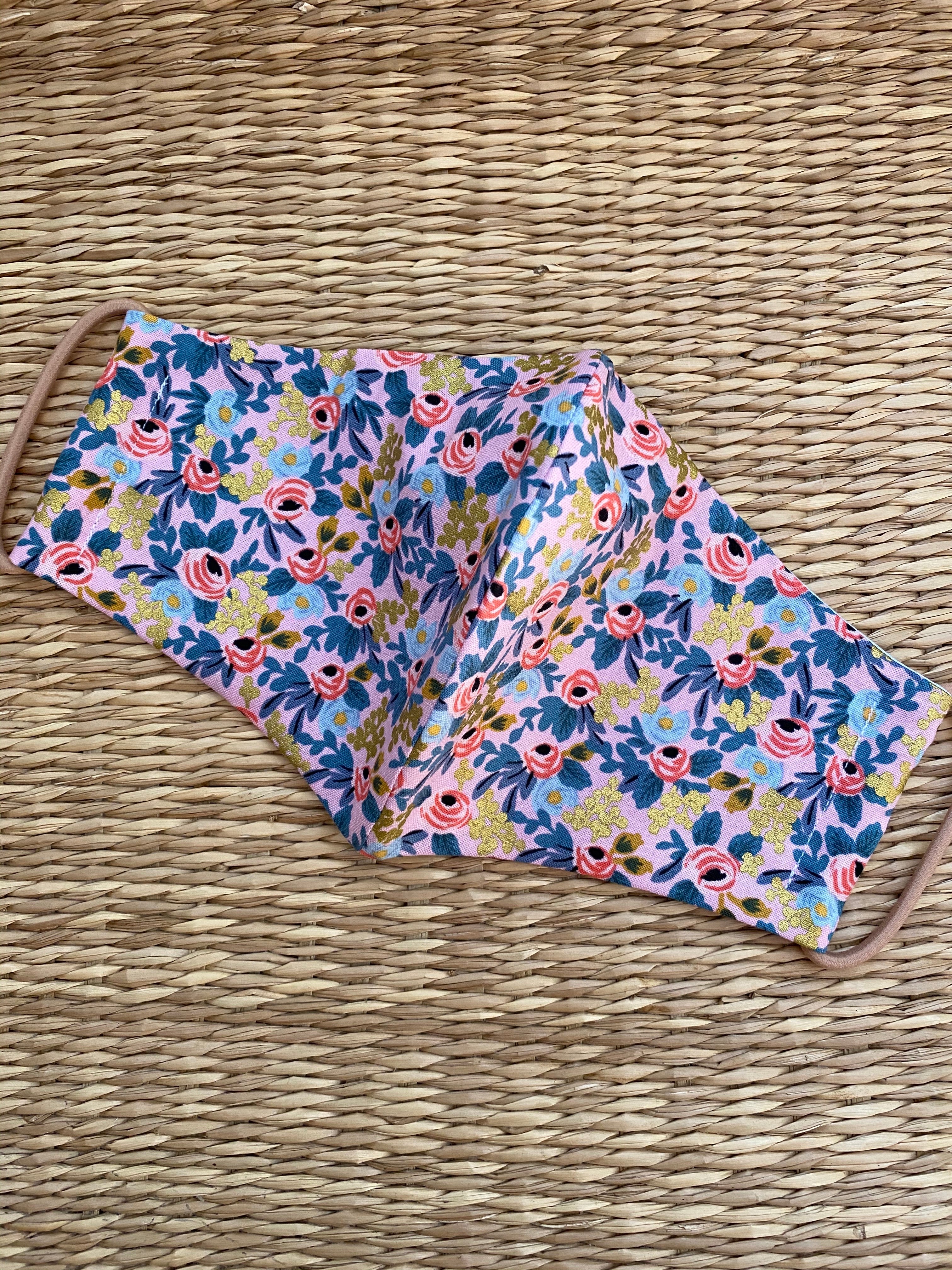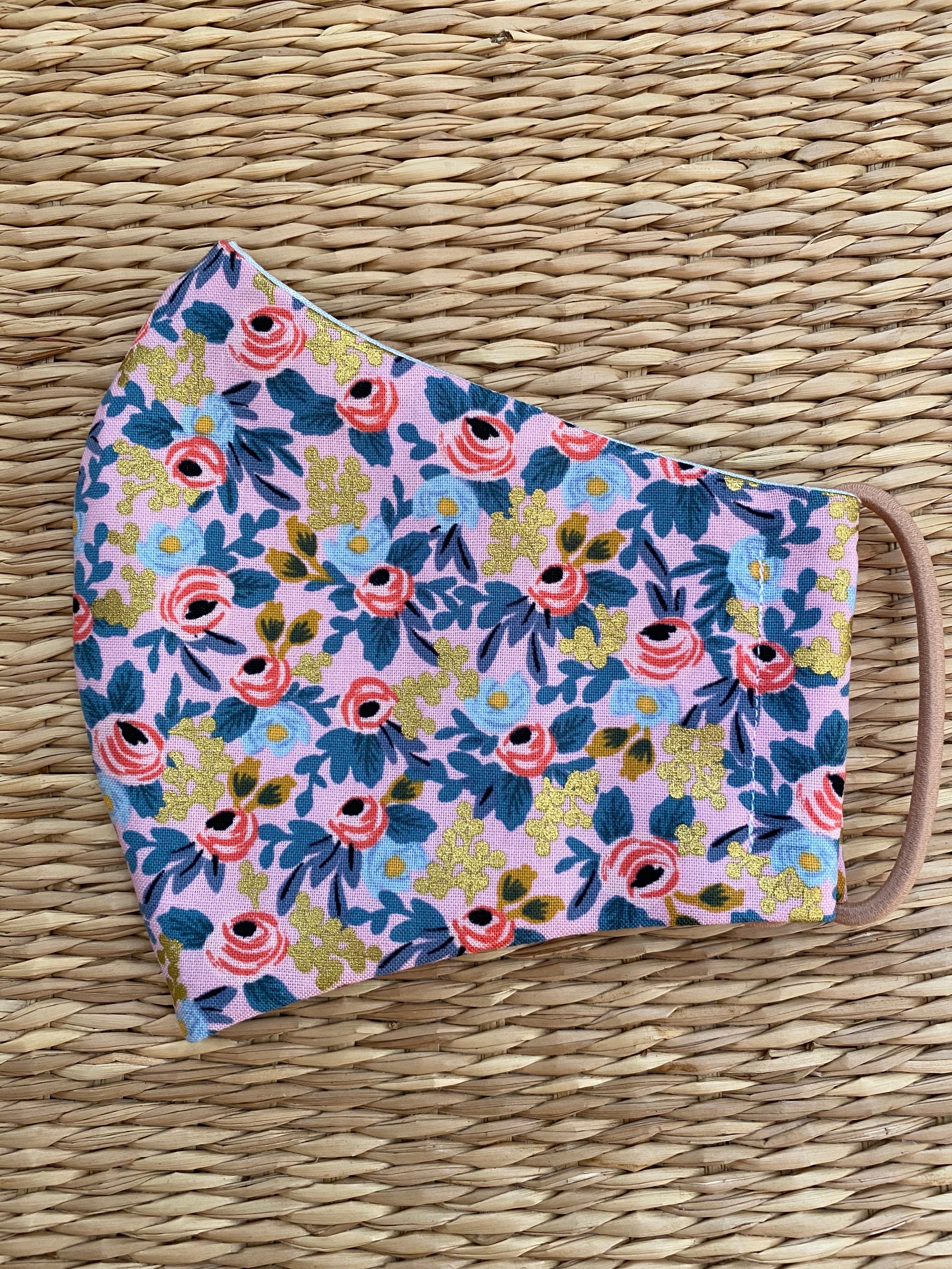 Re-usable Cotton Face Mask - Adult Size in a Rifle Paper Co. print - Rosa Violet with metallic detailing.
